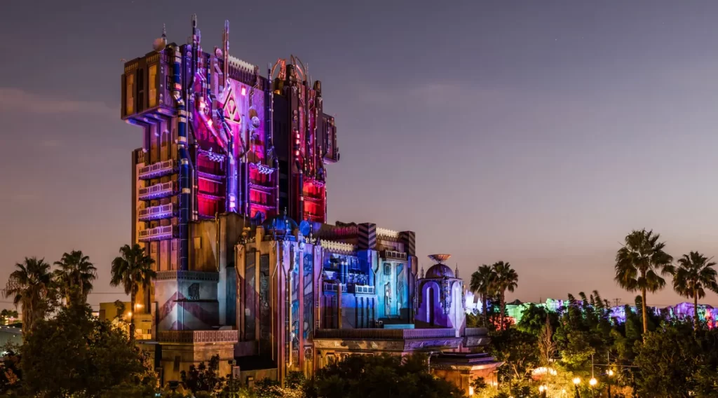 Torre da atração Guardians of the Galaxy – Mission Breakout iluminada à noite no Disney California Adventure