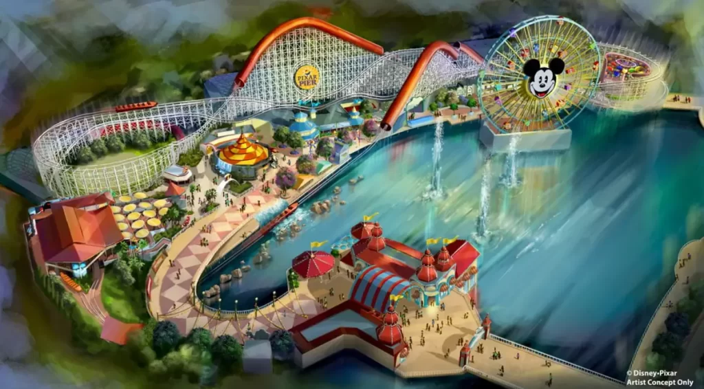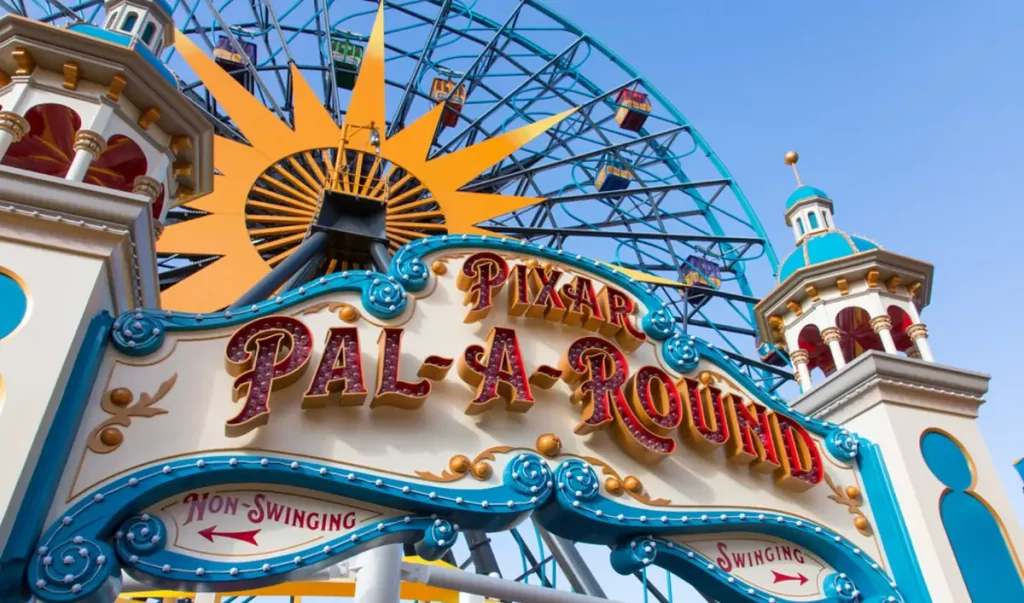 Pixar Pier – área colorida com brinquedos e lago.