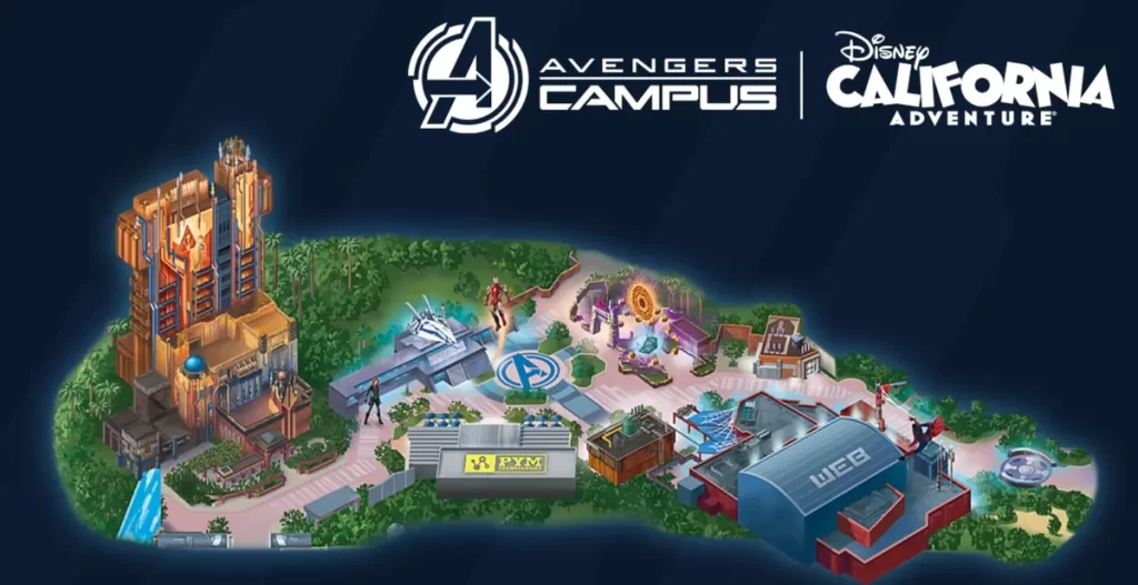 Mapa ilustrado do Avengers Campus no Disney California Adventure com atrações dos Vingadores