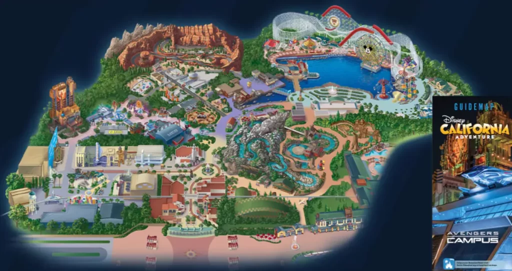 Mapa completo do Disney California Adventure destacando o Avengers Campus, Cars Land e Pixar Pier
